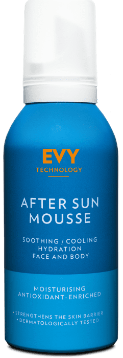 After Sun Mousse está basado en la misma fórmula que otros productos de protección solar de EVY. Crea una barrera protectora en la capa superior de la piel y refuerza sus defensas naturales sin dejar una sensación grasa ni pegajosa.